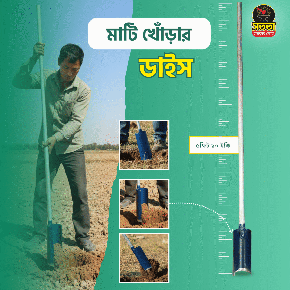 সঠিক পরিমাপ: ডাইসটির মোট লম্বা ৫ ফিট ১০ ইঞ্চি, ধারালো অংশ ১০ইঞ্চি যা দিয়ে আপনি বেশ গভীর গর্ত করতে পারবেন।