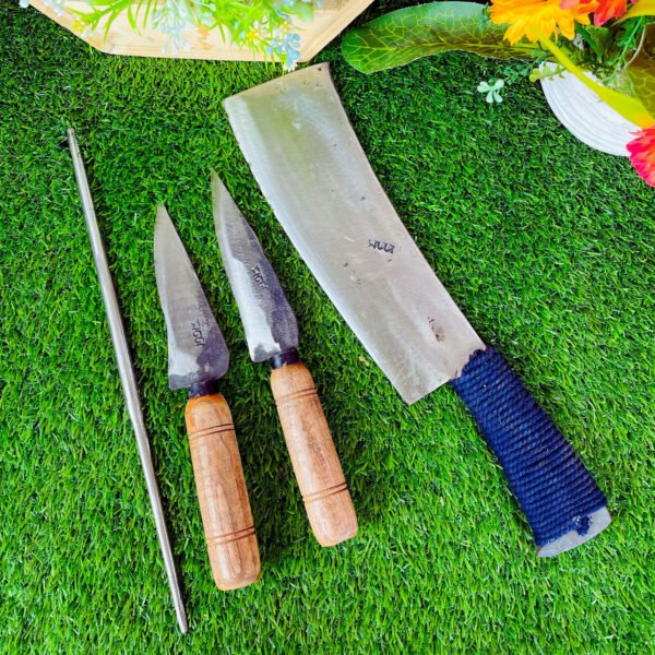 - অরিজিনাল স্প্রিং ইস্পাতের চাপাতির সাথে ২টি রেতের তৈরি চামড়া ছেলা ধারালো ছুরি।